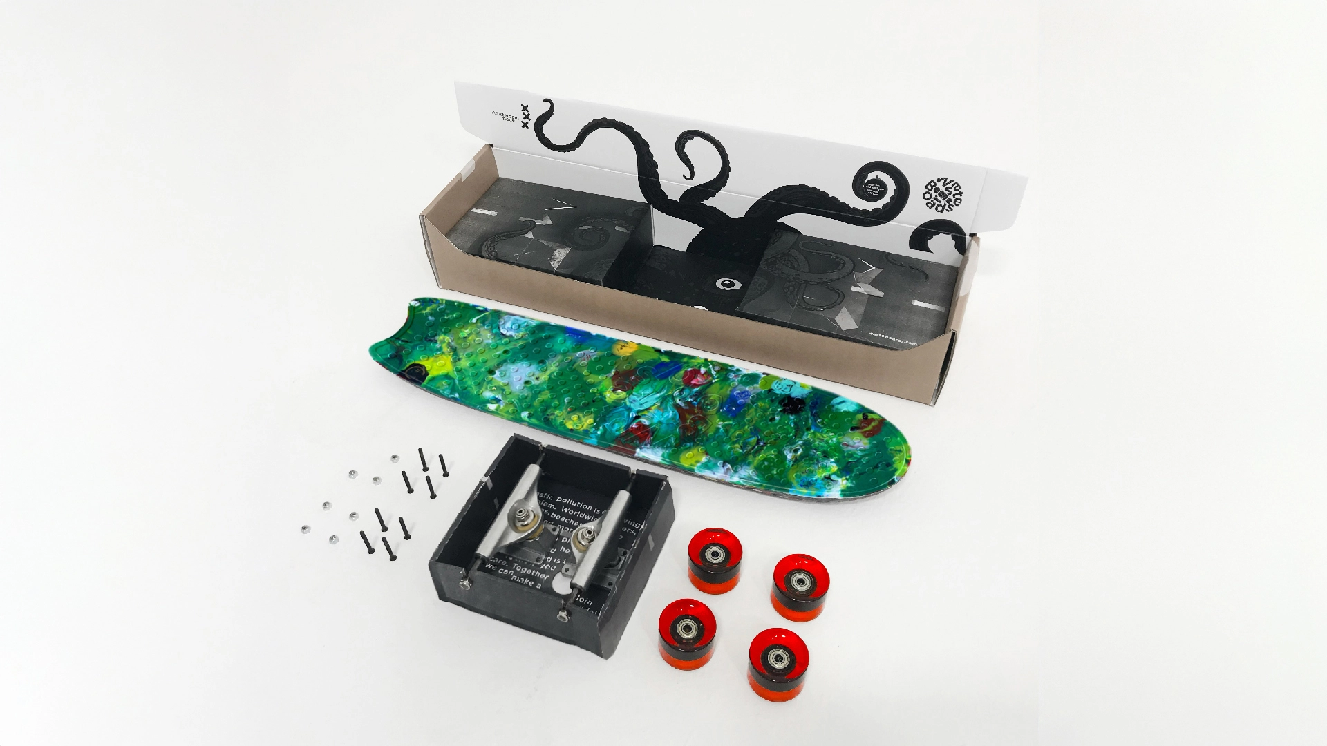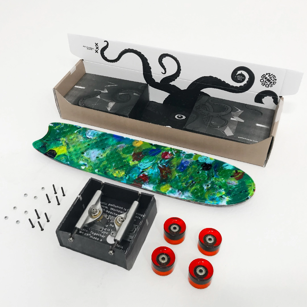 We testten het board op puntdruk tot meer dan 400 kilo. We reden er zelfs met een auto overheen — zonder dat het brak. Het deck heeft 200 antislipstuds, een lichte concave en een subtiele fishtail, als knipoog naar onze missie: de oceanen plastic vrij houden.