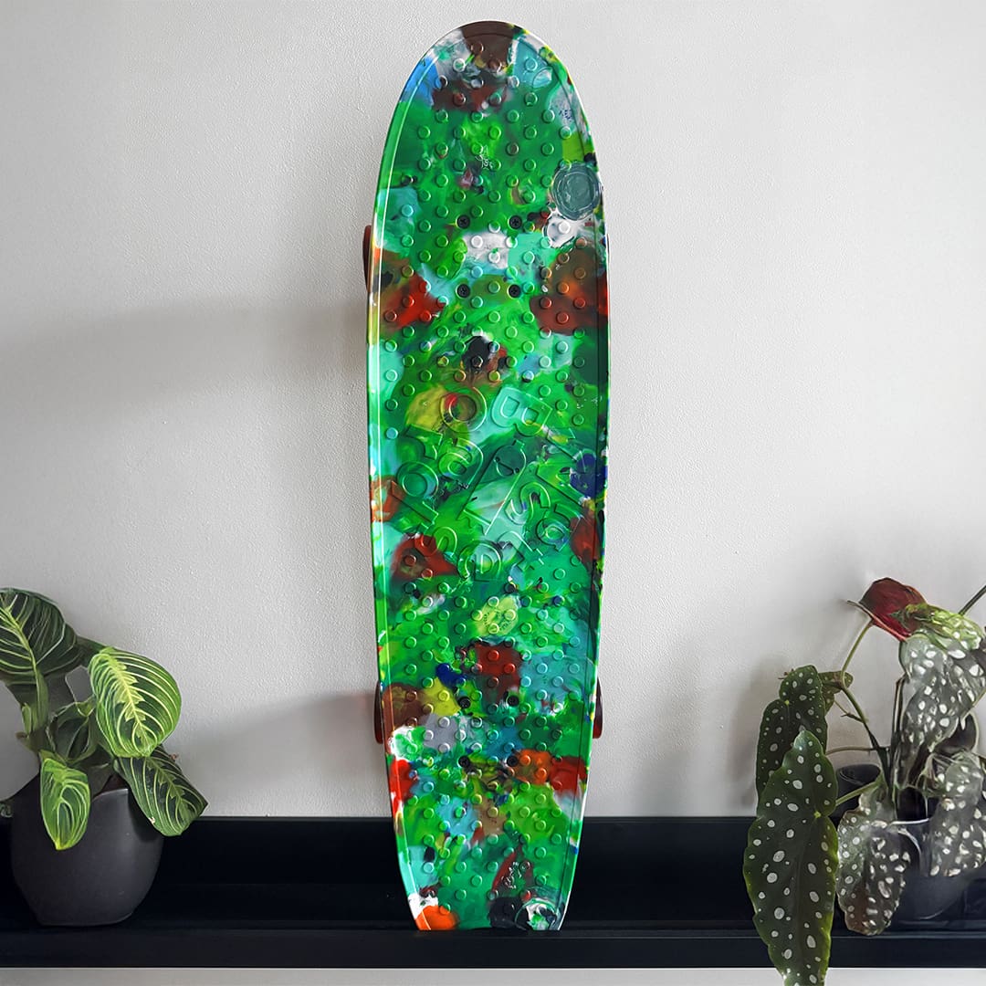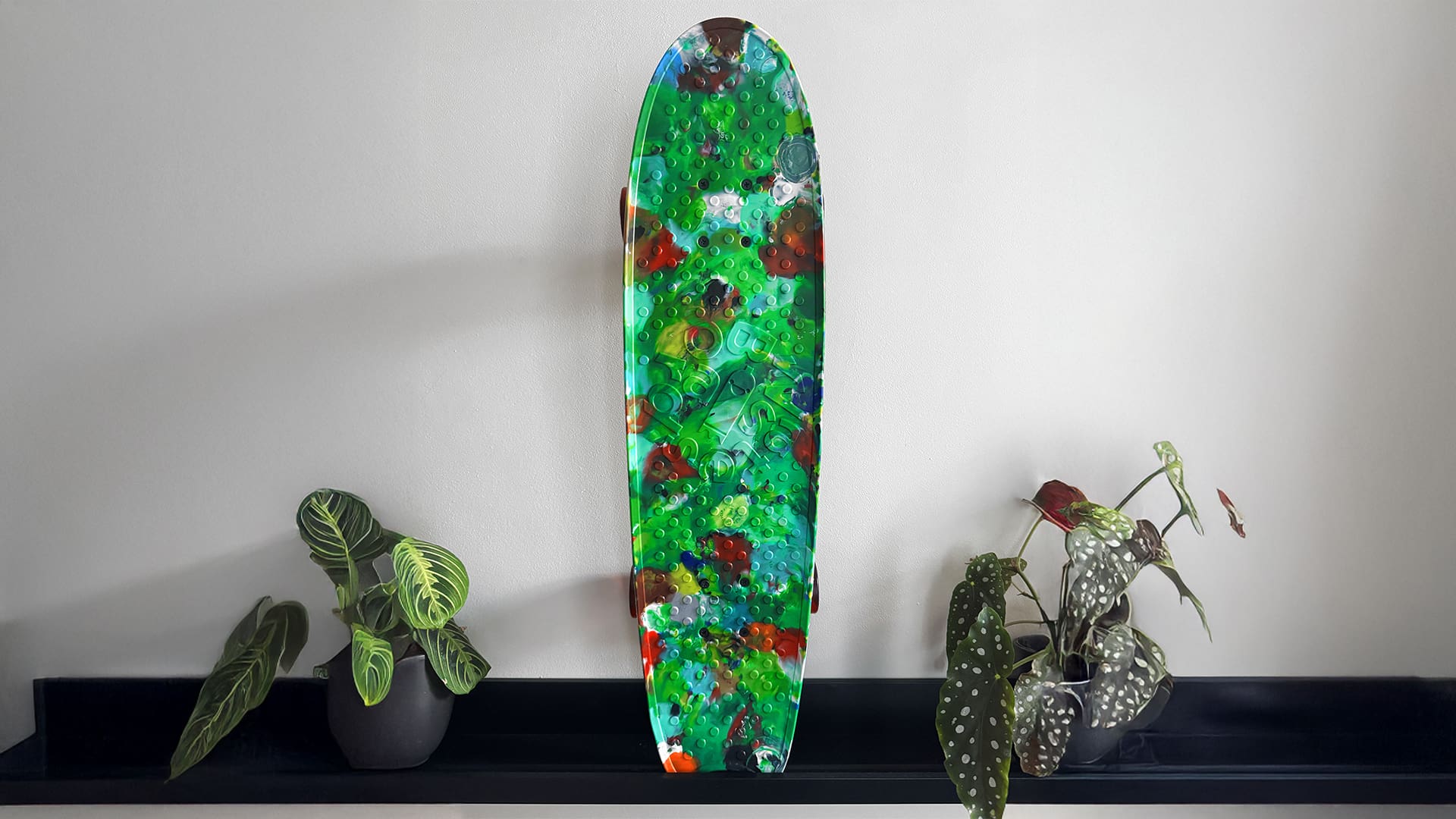 Handgemaakt Dutch Design van 850 gerecyclede plastic doppen. Geen twee boards zijn hetzelfde.
