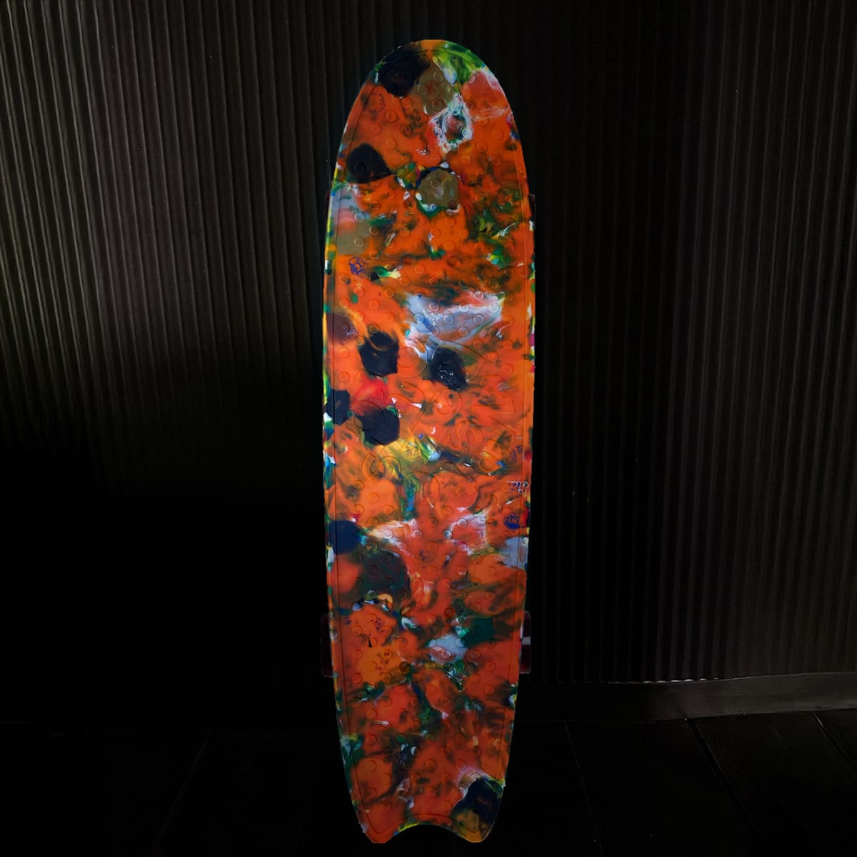 Het WasteBoard heeft een krachtig, oranje patroon — ontstaan uit honderden doppen die nooit op dezelfde manier smelten. Daarom is elk board one-of-a-kind. Geperst, gevormd en hand-finished in Nederland verkocht bij Moma NY en the Design Museum Londen.